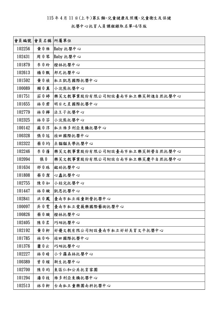 以下是115年度4/11(六)第五類-兒童健康及照護~兒童衛生及保健的錄取名單