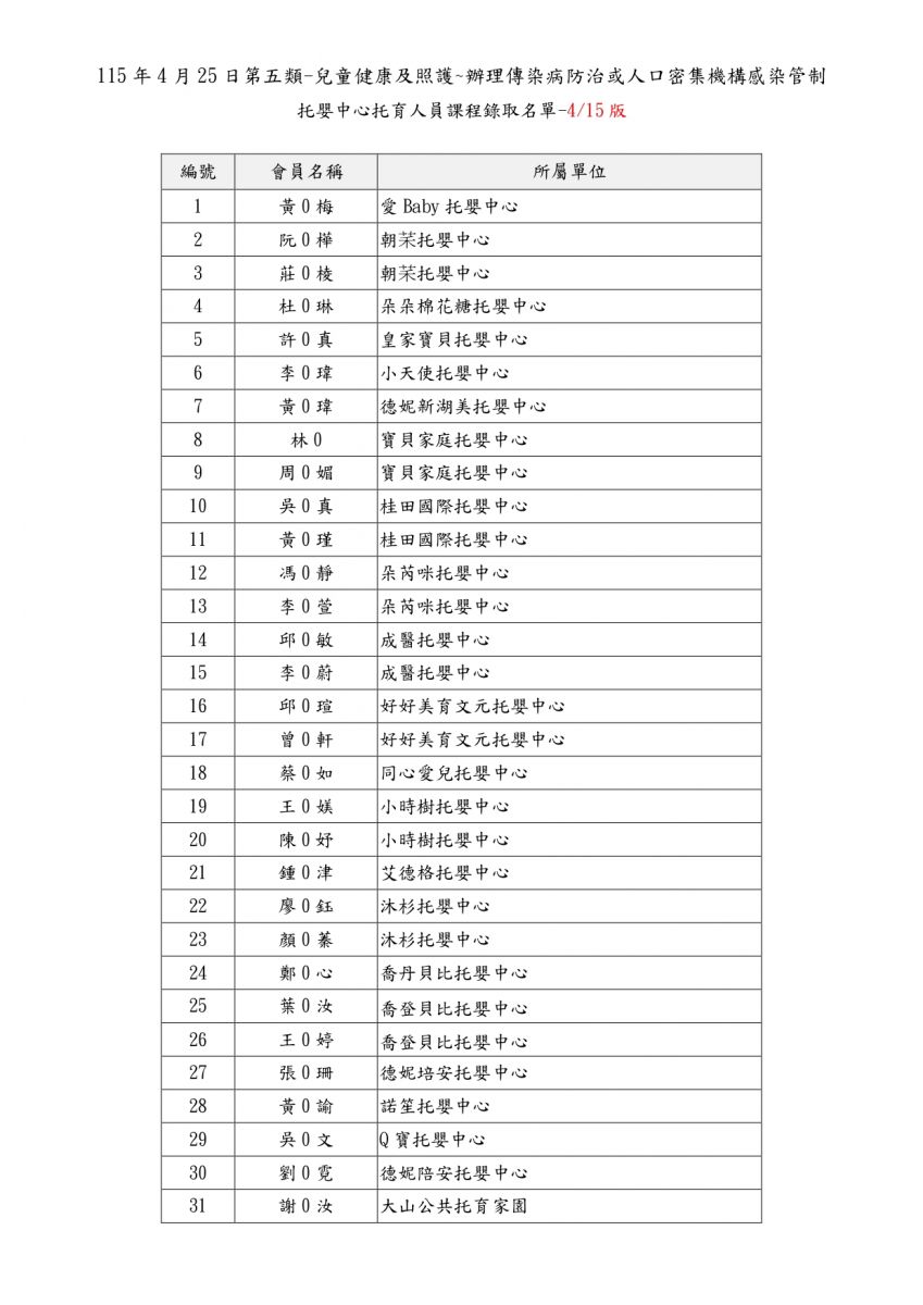 以下是115年度4/25(六)第五類-辦理傳染病防治或人口密集機構感染管制的錄取名單